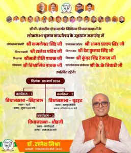 सीधी– भारतीय जनता पार्टी द्वारा लोकसभा क्षेत्र सीधी से अपने उम्मीदवार के रूप में डॉक्टर राजेश मिश्रा को मैदान में उतारा गया है इसके बाद क्षेत्र में लगातार उनकी सक्रियता देखी जा रही है। आज उनके द्वारा सिहावल, चुरहट एवं धौहनी विधानसभा क्षेत्र में लोकसभा चुनाव कार्यालय का समारोह पूर्वक उद्घाटन किया जाएगा।