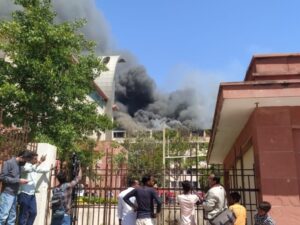 आग गेट नंबर 5 और 6 के बीच बड़ी बिल्डिंग की तीसरी मंजिल पर लगी, जो फैलते हुए चौथे, पांचवें और छठवें फ्लोर तक पहुंच गई। हवा चलने के साथ आग तेजी से फैल रही है। बताया जा रहा है कि दमकल के पांच कर्मचारी फंस गए थे, जिन्हें बाद में निकाल लिया गया। बिल्डिंग से उठती आग की लपटें और धुआं दूर से ही नजर आ रहा है। इस आग में कई अहम सरकारी दस्तावेजों के जलकर खाक होने की आशंका है। आग बुझाने के प्रयासों के बीच दो एंबुलेंस घटनास्थल से बाहर निकलकर गई हैं। इससे आग की इस घटना में कुछ लोगों के झुलसने की भी आशंका जताई जा रही है।