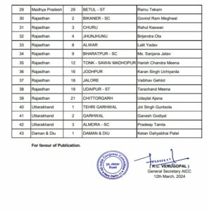 दिल्ली- कांग्रेस ने आज मंगलवार (12 मार्च) को लोकसभा उम्मीदवारों की दूसरी लिस्ट का ऐलान कर दिया। इसमें 43 उम्मीदवारों के नाम हैं।