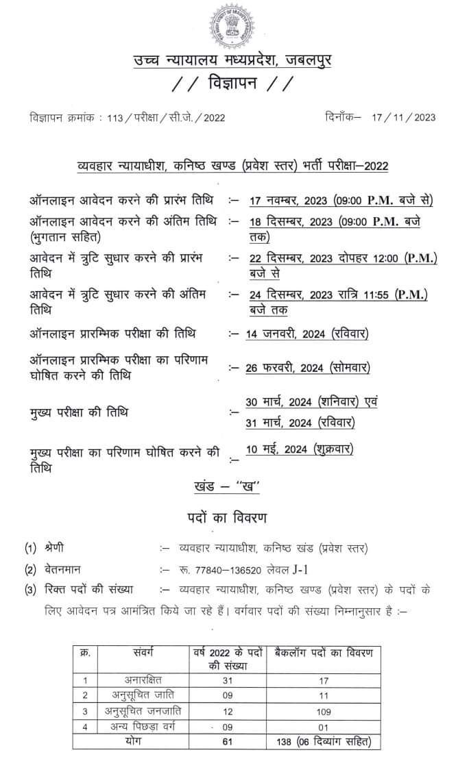 मध्य प्रदेश उच्च न्यायालय (MPHC) में निकली वैकेंसी