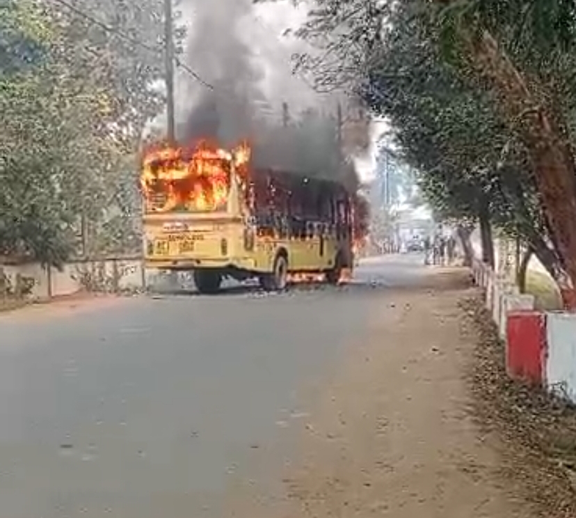 सीधी- स्कूल बस में लगी भीषण आग, बस जलकर हुई खाक, बीच सड़क पर उतारकर भागे बच्चे