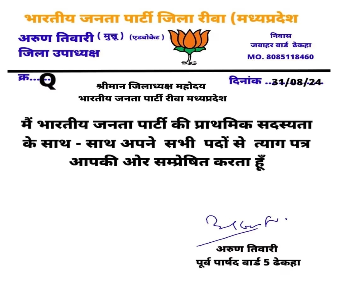 Sidhi24news;रीवा में उपचुनाव से पहले बीजेपी को झटका, पार्षदी का टिकट कटने से नाराज जिला उपाध्यक्ष ने पार्टी से दिया इस्तीफा