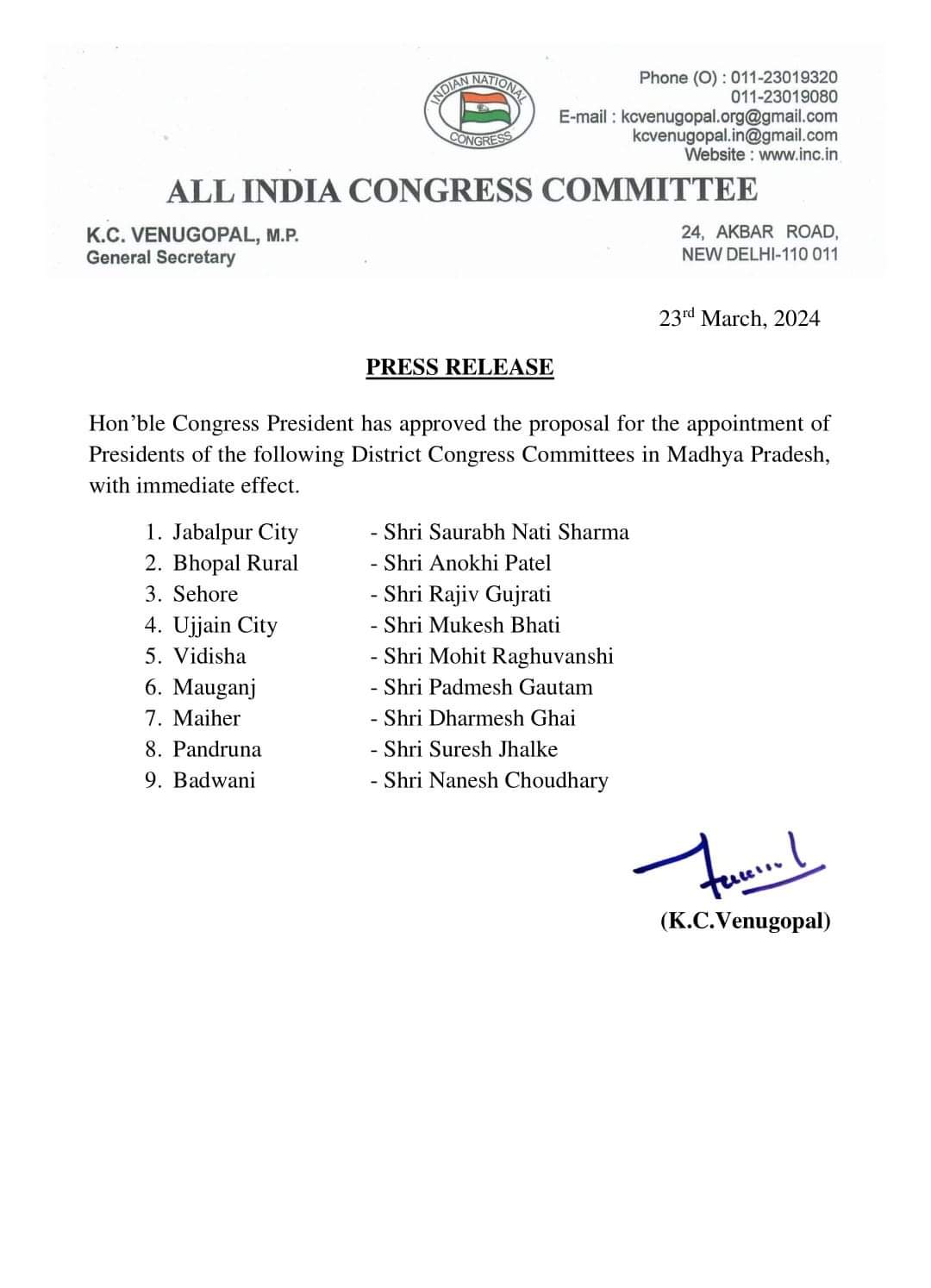 Congress news:काग्रेंस ने नियुक्त किए नौ नए जिलाध्यक्ष