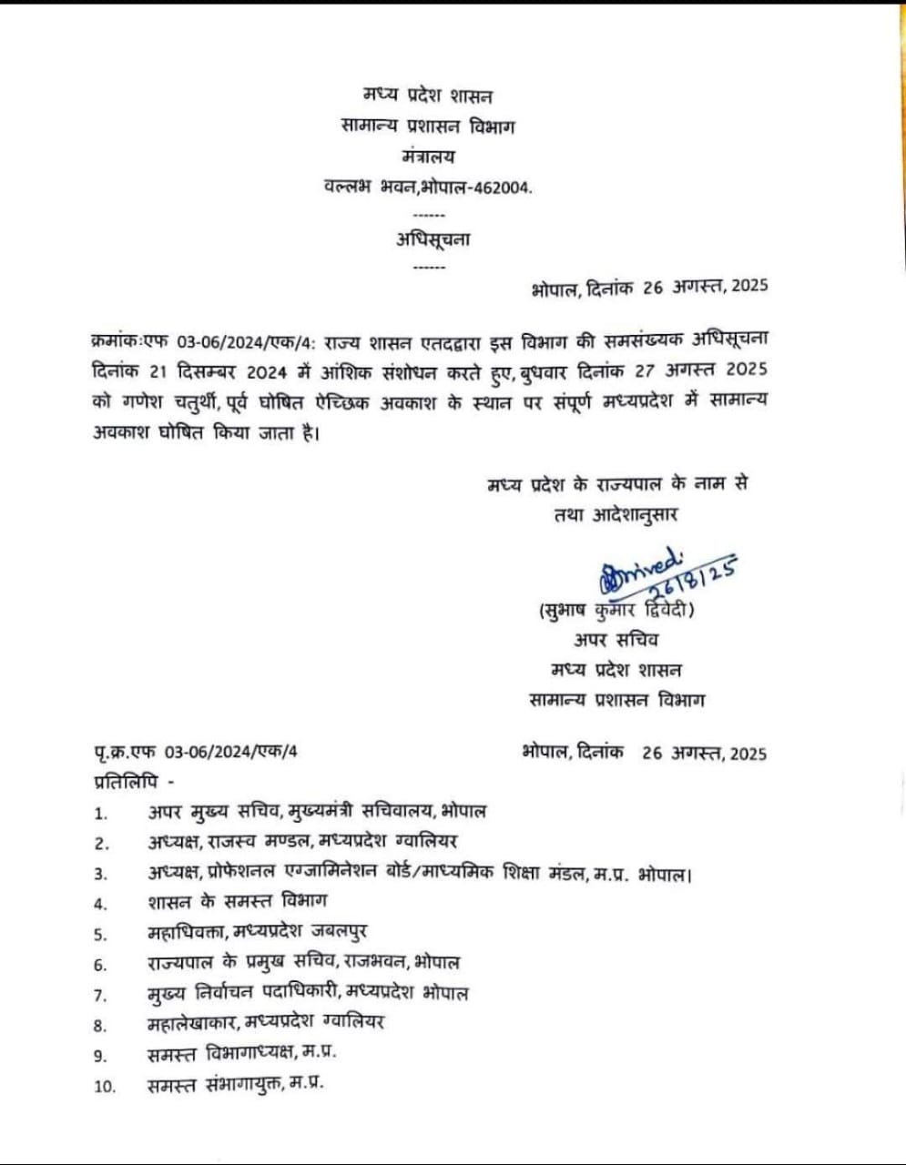 ???? गणेश चतुर्थी पर कल बुधवार को रहेगा अवकाश, शासन ने जारी किया आदेश